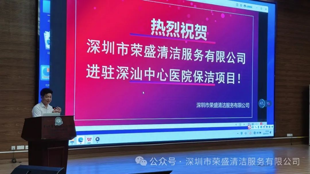 5月1日下午四时,深圳市金地物业有限公司领导和全体项目员工汇集医院礼堂,欢庆深圳市荣盛清洁服务有限公司正式进驻深汕中心医院,员工吃着点心,喝着饮料,看着公司宣传片,听着公司董事长热情洋溢的致词,现场一片欢腾和喜悦。